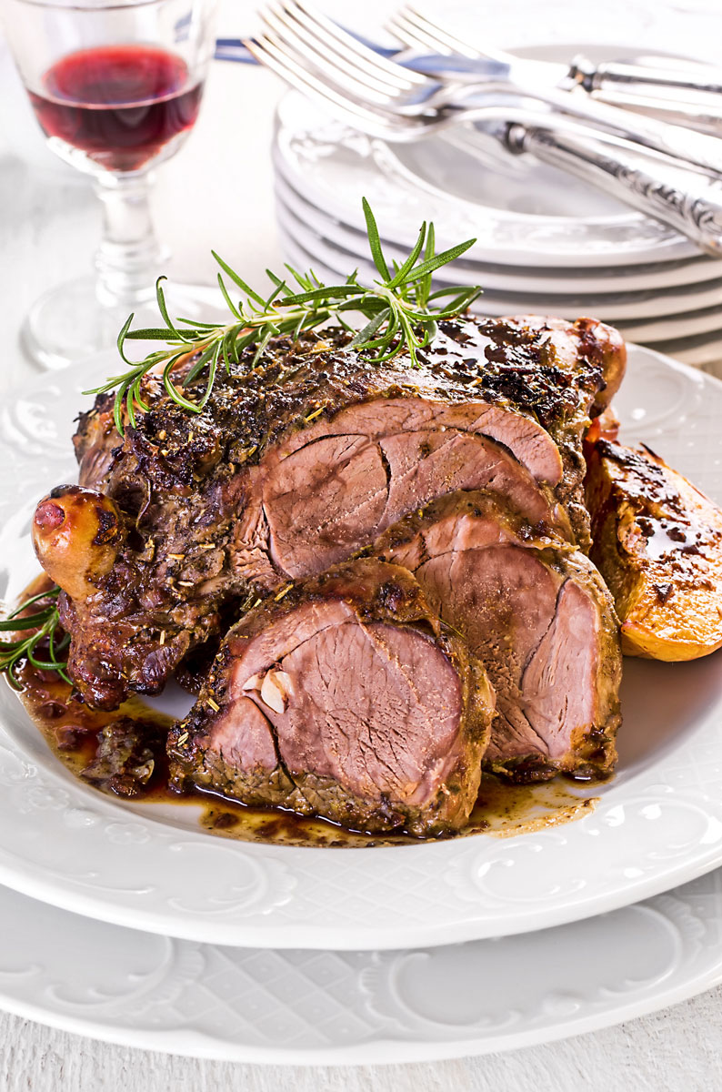 Geben Sie währenddessen Öl, Kräuter und den gepressten Knoblauch in ein Schälchen und verrühren Sie das Ganze. Die Kräutermischung wird nun vorsichtig auf dem Schmorbraten verteilt. Anschließend wird die Keule bei offenem Deckel noch einmal bis zu 50 Minuten im Backofen gegart. Danach wird der entstandene Bratenfond durchgesiebt und auf ca. 370 Milliliter aufgefüllt. Dazu geben Sie Mehl, das in etwas Wasser verrührt wurde, und lassen den Bratenfond fünf Minuten köcheln.