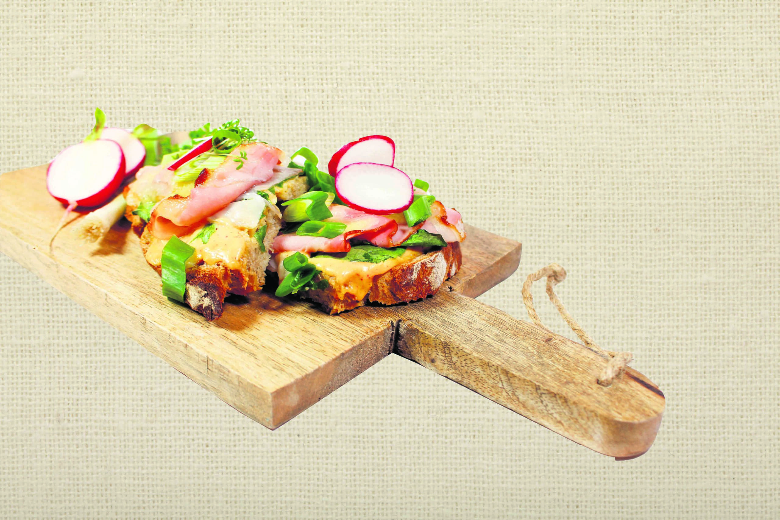 in Scheiben geschnittener Frühlingszwiebel bestreuen. Darauf einige Scheiben Frühstücksschinken legen und zum Schluss mit Bergkäse belegen. Jetzt kommen die Brote 5 bis 7 Minuten in den Ofen – bei Grillstufe ca. 250°C. Vor dem Servieren in mundgerechte Stücke schneiden – fertig!