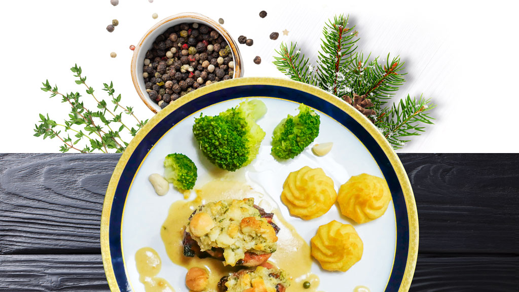4 – Backofen vorheizen (E-Herd: 200°C / Umluft: 175°C). Medaillons für 8-10 Minuten backen. Herzoginkartoffeln nach Packungsanweisung zubereiten.