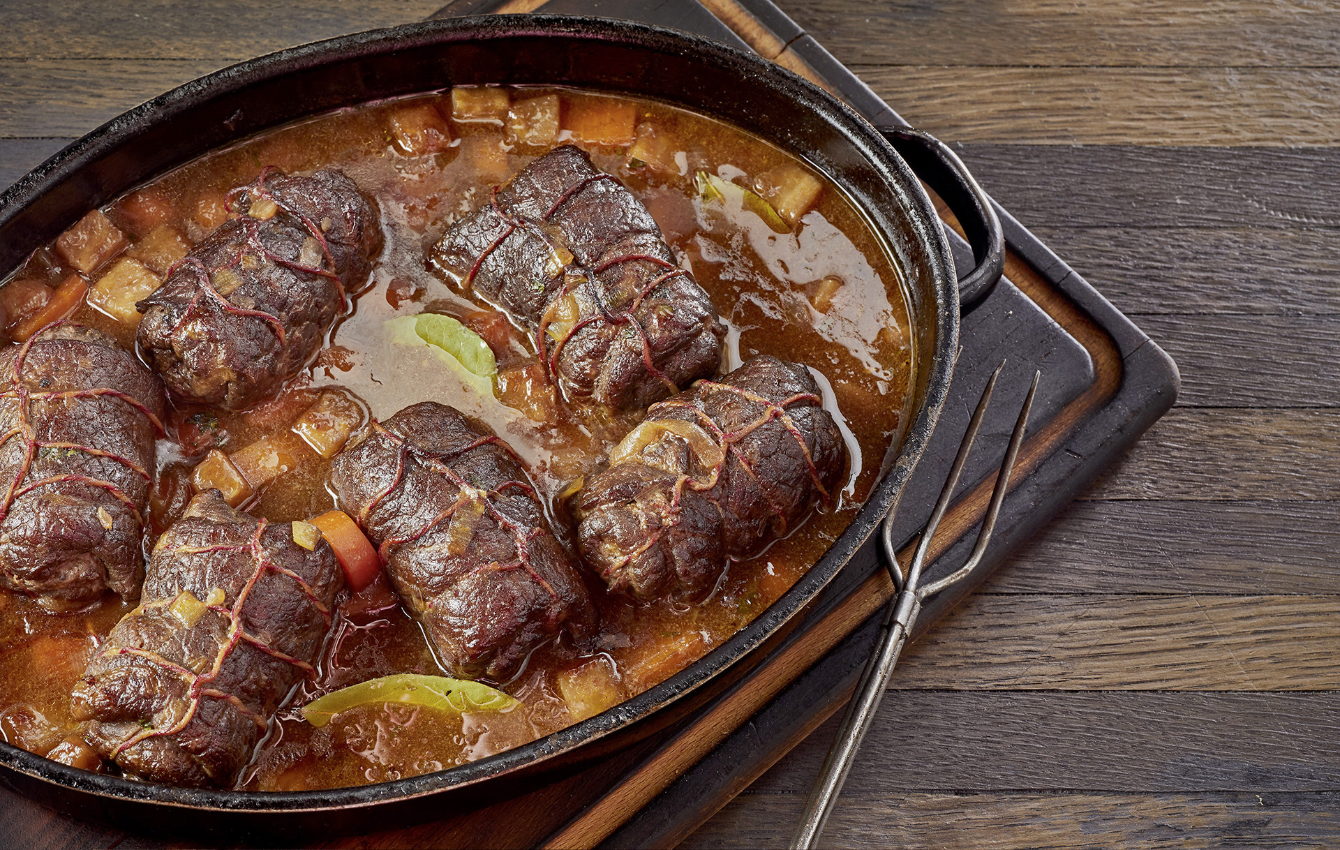 Die Zubereitung erfolgt dann nach dem bekannten Schema: von allen Seiten scharf anbraten. Die Rouladen entnehmen und beiseitestellen. Jetzt Wurzelgemüse anrösten, Tomatenmark hinzugeben und ebenfalls anrösten, mit Rotwein ablöschen. Die Rouladen wieder in den Topf geben und mit Fleischbrühe aufgießen bis das Fleisch bedeckt ist. Mit Lorbeerblatt und Piment würzen. Jetzt auf kleiner Flamme etwa 90 Minuten schmoren.